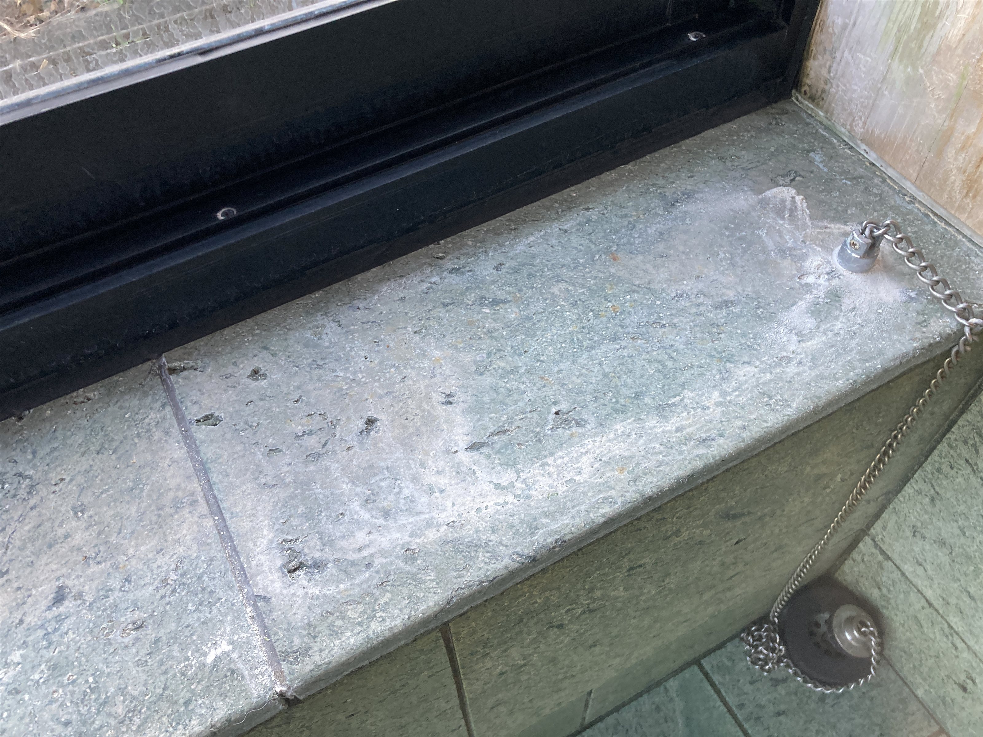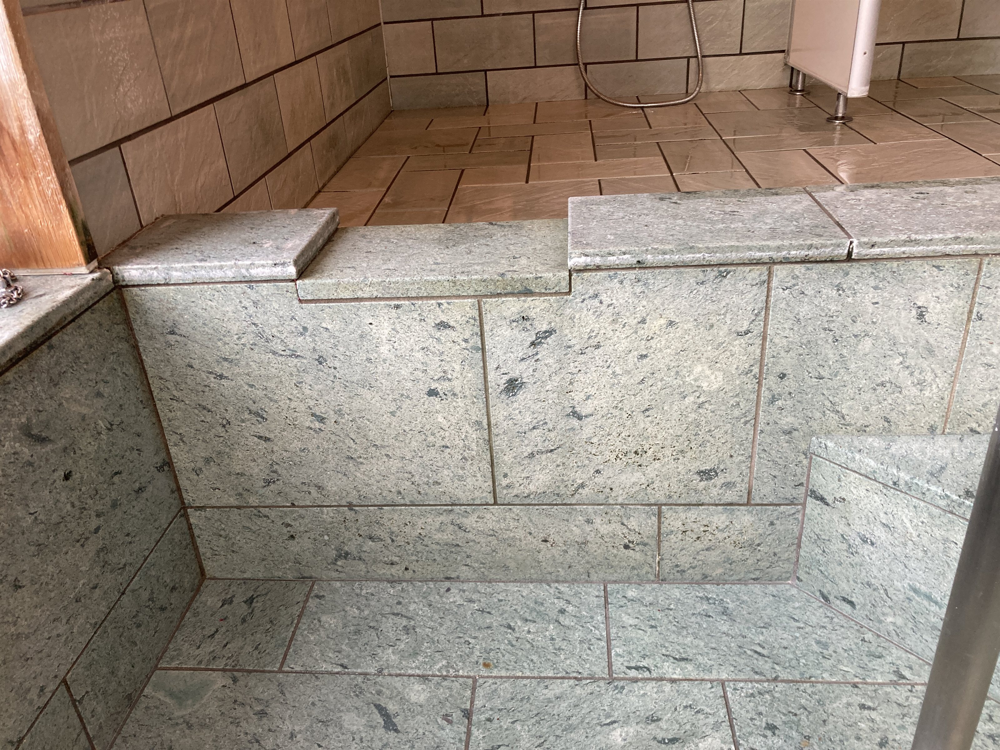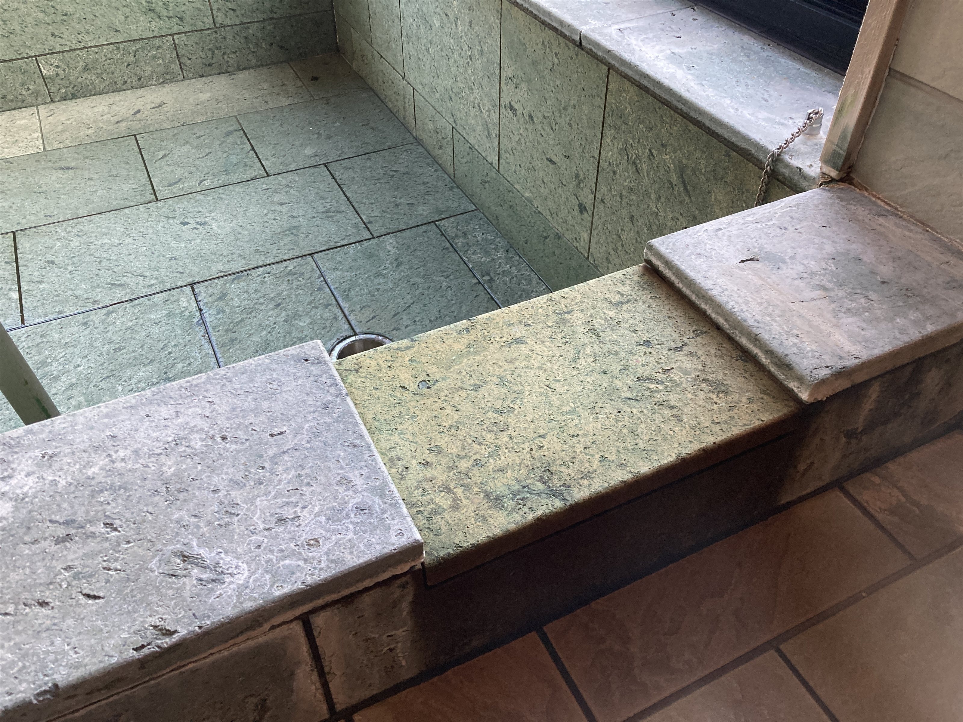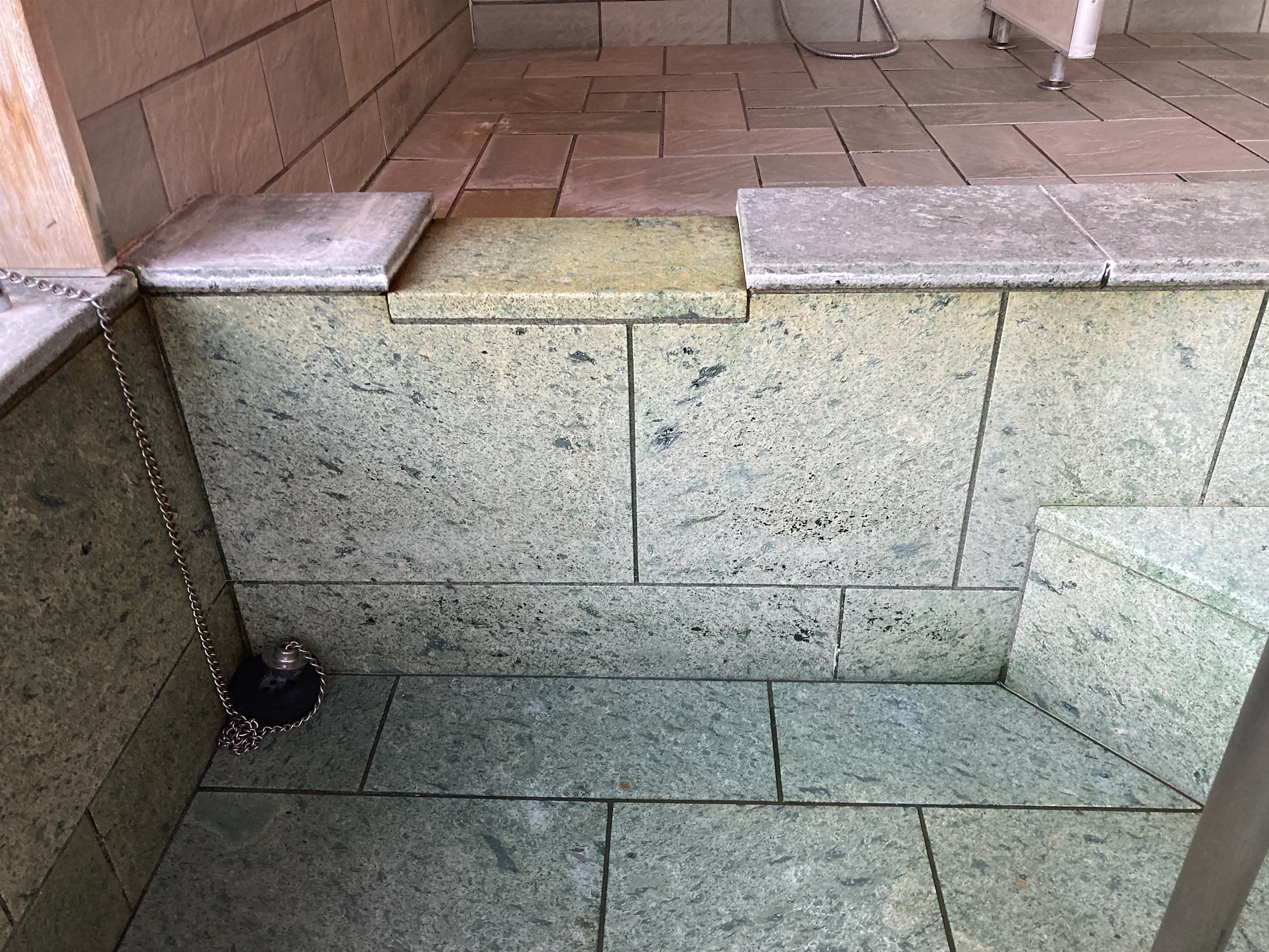 温泉の酸化鉄、温泉あくがついて赤茶色のさびのような汚れが付く。